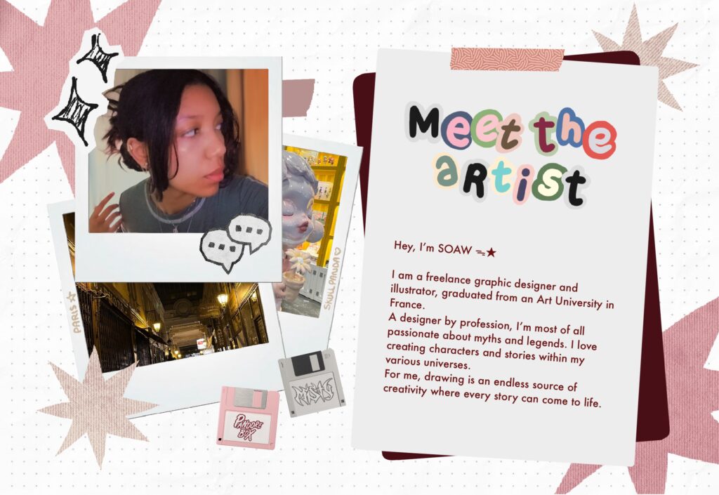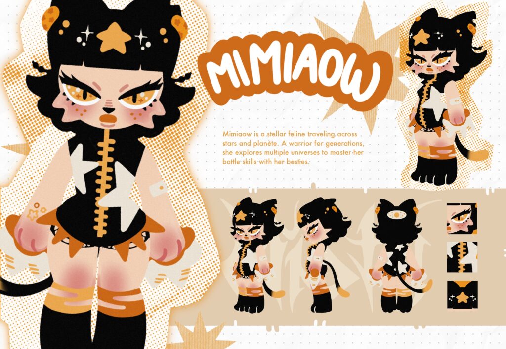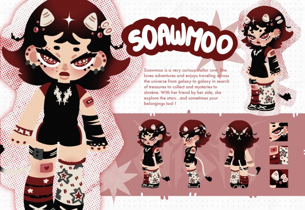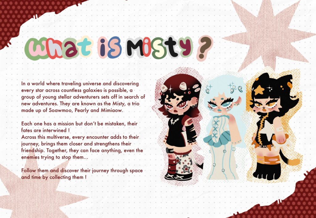 Misty est ma participation au « POP MY ART » de POP MART. Étant une grande collectionneuse de goodies et de figurine, j’ai créé Misty en intégrant mon artsona Soawmoo une petite vache interstellaire. Rentrez dans son univers accompagnée de ses amies Pearly et Mimiaow !